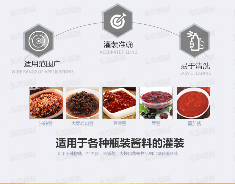 4、顆粒醬定量灌裝機(jī)主要針對(duì)食品行業(yè)的醬類分裝設(shè)計(jì)生產(chǎn),香菇醬灌裝機(jī)特別適用于調(diào)味品中帶顆粒并且濃度較大的辣椒醬、豆瓣醬、花生醬、芝麻醬、果醬、牛油火鍋底料、紅油火鍋底料等物質(zhì)的粘稠醬類的灌裝;