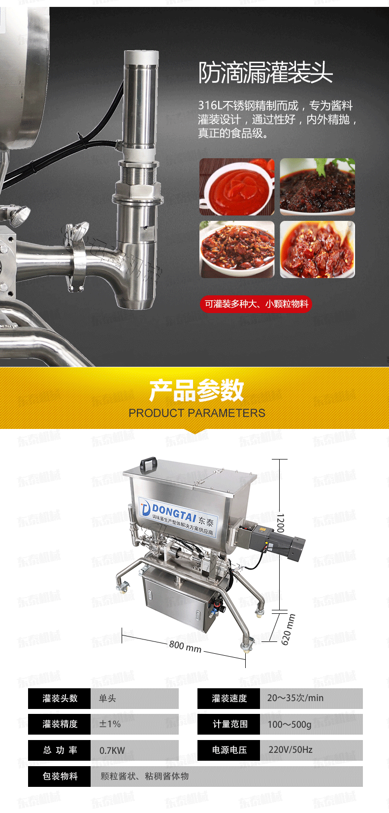 隨著機(jī)械化時(shí)代的到來,讓我們的生活進(jìn)入智能化的時(shí)代,近年來醬行業(yè)的快速發(fā)展擴(kuò)大了辣椒醬灌裝機(jī) 的市場(chǎng)需求,進(jìn)一步提高了辣椒醬灌裝機(jī) 的生產(chǎn)效率和自動(dòng)化的加強(qiáng),企業(yè)對(duì)醬灌裝的灌裝物料完整性要求越來越高,因此,東泰機(jī)械對(duì)顆粒醬灌裝物料完整性進(jìn)行了調(diào)試和調(diào)整,我們今天一起看一下這款大顆粒醬都可以灌裝的辣椒醬灌裝機(jī)到底有什么優(yōu)勢(shì)?